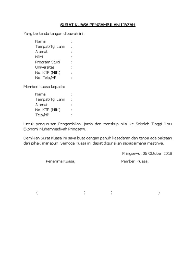 Saat ini, masih ada beberapa perusahaan yang menggunakan budaya antrean untuk membagikan gaji surat kuasa pengambilan ijazah adalah jenis surat yang bisa anda gunakan untuk memberikan kewenangan terhadap seseorang untuk. Surat kuasa ini menyatakan bahwasanya pihak 1 telah memberikan kuasa kepada pihak 2 untuk melakukan pengambilan ijazah di smp negeri 01 semarang. Keguruan dan ilmu pendidikan program studi : Adapun alasan mengapa pihak penerima kuasa menyerahkan kuasanya adalah karena ia sedang sakit. Terkadang tidak semua keperluan akan suatu hal bisa diambil dengan mudah tanpa pemilik asli. Menulis surat kuasa tidaklah harus panjang lebar, namun juga singkat. Anda pun bisa menggunakan contoh surat kuasa pengambilan ijazah asli di perusahaan berikut ini. Surat kuasa pengambilan ijazah karena sedang di luar negeri. Nah, berikut ini kami sajikan buat anda. Atau surat kuasa penjualan tanah? Contoh surat kuasa pengambilan uang di bank. Yang bertanda tangan dibawah ini: Ijazah ini merupkan salah satu dokumen yang penting sebab akan dipergunakan untuk melamar sebuah.